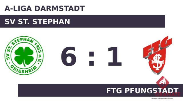 Dilar Memeti brachte sein Team in der 32. Minute nach vorn. In der 34. Minute brachte Francesco Torino das Netz für den SV St. Stephan zum Zappeln. Kurz vor dem Halbzeitpfiff (45.) baute Gordon Choynowski die Führung des SV St. Stephan aus. Der SV St. Stephan dominierte den Gegner zur Pause nach Belieben und ging mit einer deutlichen Führung in die Kabine. Für die Vorentscheidung waren Philipp Root (55.) und Torino (56.) mit zwei schnellen Treffern verantwortlich. Kevin Leiss erzielte in der 57. Minute den Ehrentreffer für die FTG Pfungstadt. K. A. stellte schließlich in der 80. Minute den 6:1-Sieg für den SV St. Stephan sicher. Mit dem Schlusspfiff durch Referee Mustafa Simsek (Offenbach am Main) fuhr der SV St. Stephan einen Kantersieg ein, der sich schon vor der Halbzeitpause abgezeichnet hatte.
