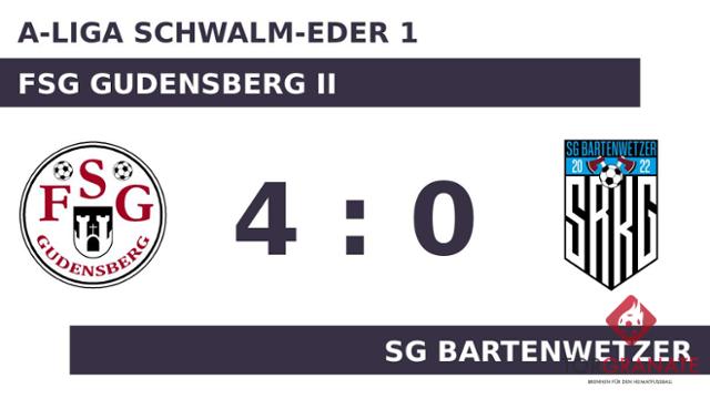 Die SG Bartenwetzer geriet schon in der siebten Minute in Rückstand, als Richard Wanner das schnelle 1:0 für die Gudensberg II erzielte. Die FSG Gudensberg II machte weiter Druck und erhöhte den Spielstand im Eilschritt durch einen Treffer von Nicholas Boehling (9.). Die Hintermannschaft der SG Bartenwetzer ließ bis zur Pause kein weiteres Tor zu und es ging bei unverändertem Stand in die Kabinen. Lasse Otter Stoll legte in der 87. Minute zum 3:0 für die Gudensberg II nach. Wanner stellte schließlich in der 90. Minute den 4:0-Sieg für das Heimteam sicher. Am Ende kam die FSG Gudensberg II gegen die SG Bartenwetzer zu einem verdienten Sieg.