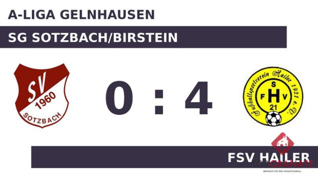 Kaum war das Spiel angepfiffen, lagen die Gäste bereits in Front. Paul Neun markierte in der fünften Minute die Führung. Bereits in der 14. Minute erhöhte k.A. k.A. den Vorsprung des FSV Hailer. Mit dem 3:0 von Andrew Jordan Weber für den FSV Hailer war das Spiel eigentlich schon entschieden (17.). Die SG Sotzbach/Birstein rettete sich mit einem deutlichen Rückstand in die Halbzeitpause. Andreas Prisjaschnueck besorgte in der Schlussphase schließlich den vierten Treffer für den FSV Hailer (80.). Letzten Endes ging der FSV Hailer im Duell mit der SG Sotzbach/Birstein als Sieger hervor.