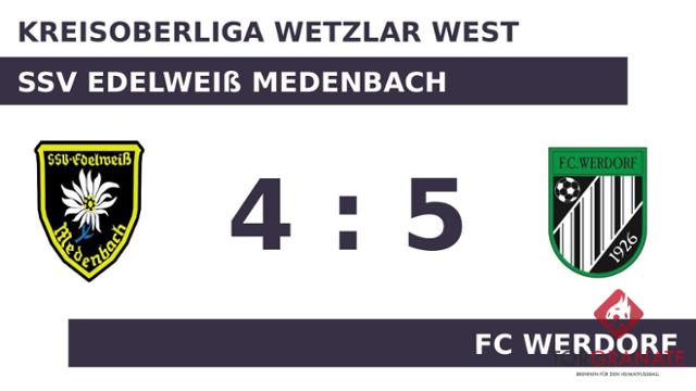 Kaum war das Spiel angepfiffen, lag der FC Werdorf bereits in Front. Niklas Schleifer markierte in der vierten Minute die Führung. Erik Reich glänzte an diesem Tag besonders. Er traf im Doppelpack für den Gast (19./36.). Nach nur 21 Minuten verließ Timo Strassen vom SSV Edelweiß Medenbach das Feld, David Benner kam in die Partie. Die Heimmannschaft verkürzte den Rückstand in der 39. Minute durch einen Elfmeter von Jannis Halfmann auf 1:3. Mit einem Eigentor kam das Edelweiß Medenbach noch einmal ran (43.). Der Schiedsrichter schickte schließlich beide Mannschaften ohne weitere Änderung am Spielstand in die Kabinen. Mit einem Wechsel – Abdul Saber Qateh kam für Robin Christian Diekmann – startete der FC Werdorf in Durchgang zwei. Marvin Maurer glich nur wenig später für den SSV Edelweiß Medenbach aus (47.). Für das vierte Tor des FC Werdorf war Tobias Grothe verantwortlich, der in der 59. Minute das 4:3 besorgte. Niklas Discher witterte seine Chance und schoss den Ball zum 4:4 für das Edelweiß Medenbach ein (70.). Gefeierter Mann des Spiels war Reich, der dem FC Werdorf mit seinem Treffer in der 90. Minute den Vorsprung brachte. Ein Debakel, nach dem es zunächst ausgesehen hatte, konnte das Edelweiß Medenbach noch verhindern. Doch zu etwas Zählbarem kam der SSV Edelweiß Medenbach am Ende nicht mehr.