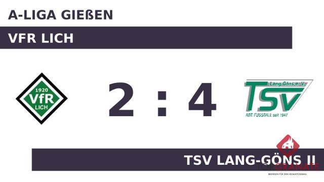 Finn Johannson brachte die Gastgeber in der 30. Minute ins Hintertreffen. Maximilian Mueller brachte den Ball zum 2:0 zugunsten des TSV Lang-Göns II über die Linie (32.). Kurz vor dem Halbzeitpfiff (44.) baute Julian Scherer die Führung der Gäste aus. Der TSV Lang-Göns II hatte die Chancen genutzt und blickte zur Pause auf einen deutlichen Vorsprung. Für das 1:3 des VfR Lich zeichnete Jannik Joerg verantwortlich (52.). Nico Uhl verkürzte für den VfR Lich später in der 61. Minute auf 2:3. Damon Landau versenkte die Kugel zum 4:2 für den TSV Lang-Göns II (63.). In den 90 Minuten war der TSV Lang-Göns II im gegnerischen Strafraum erfolgreicher als der VfR Lich und fuhr somit einen 4:2-Sieg ein.