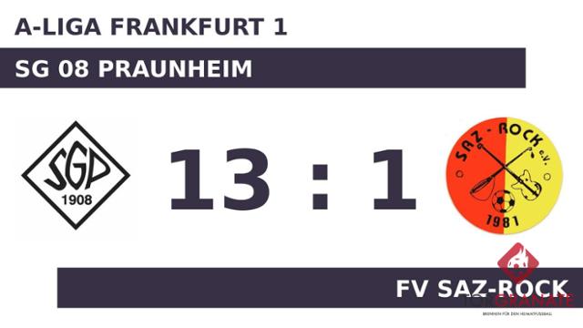 Der Tabellenletzte geriet schon in der siebten Minute in Rückstand, als Elias Bouharrou das schnelle 1:0 für SG Praunheim erzielte. SG 08 Praunheim machte weiter Druck und erhöhte den Spielstand im Eilschritt durch einen Treffer von Fardin Rahimi (8.). Ramon Bolender brachte den Gastgeber in ruhiges Fahrwasser, indem er das 3:0 erzielte (15.). Für Ali Senal war der Einsatz nach 15 Minuten vorbei. Für ihn wurde Moustafa Conteh eingewechselt. SG Praunheim baute die Führung aus, indem Samuel Brehloehr zwei Treffer nachlegte (16./30.). Nach nur 27 Minuten verließ Hieu Pham Trung vom FV Saz-Rock das Feld, Mustafa Alkan kam in die Partie. Can Güler verkürzte für die Gäste später in der 38. Minute auf 1:5. Innerhalb weniger Minuten trafen Rahimi (42.) und Bouharrou (44.). Damit bewies SG 08 Praunheim nochmals die Durchschlagskraft der Offensive. Die Partie war für den FV Saz-Rock bereits zur Pause gelaufen. Ausdruck der gegnerischen Dominanz war ein schier unüberwindbarer Rückstand. SG Praunheim konnte mit dem ersten Durchgang sehr zufrieden sein. Trotzdem gab es Veränderungen bei SG 08 Praunheim. Haakon Föhrenbach ersetzte Brehloehr, der nun schon vorzeitig Feierabend machte. Wenig später verwandelte Nico Tahirovic einen Elfmeter zum 8:1 zugunsten von SG Praunheim (48.). SG 08 Praunheim baute den Vorsprung mit der Hilfe des Gegners weiter aus: 9:1 für SG Praunheim durch ein Eigentor des FV Saz-Rock in der 50. Minute. Tom Erik Schmitt besorgte in der Schlussphase schließlich den 13. Treffer für SG 08 Praunheim (80.). Am Ende ließ SG Praunheim kein gutes Haar am FV Saz-Rock und siegte außerordentlich hoch.