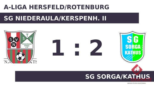 Nach nur 24 Minuten verließ Jan Skoupy vom Gastgeber das Feld, Yannick Schmidt kam in die Partie. Der für Nils Magnus Pfaff ins Spiel gekommene Rudolf Görzen sollte in der Offensive ein Zeichen setzen (28.). Die SG Sorga/Kathus ging durch Alexander Görzen in der 30. Minute in Führung. Für das zweite Tor des Gasts war Rudolf Görzen verantwortlich, der in der 38. Minute das 2:0 besorgte. Es waren die Gäste, die zur Pause eine Führung ihr Eigen nannten. Durch einen von André Hirschhäuser verwandelten Elfmeter gelang der SG Niederaula/Kerspenh. II in der 52. Minute der 1:2-Anschlusstreffer. Obwohl der SG Sorga/Kathus nach erfolgreicher erster Hälfte keine weiteren Tore gelangen, schaffte es Niederaula/Kersp. II zugleich nicht, die Partie zu drehen. Sie endete mit 2:1.