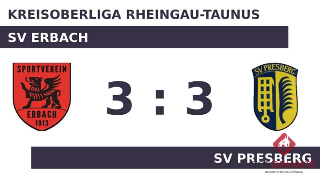 Torlos ging es zur Halbzeitpause in die Kabinen. Der SV Presberg ging durch Alem Dupljank in der 56. Minute in Führung. Der SV Erbach drängte auf den Ausgleich. Für frischen Wind sollten Milad Azar und Robin Römer sorgen, die per Doppelwechsel für Goekhan Eroglu und Kevin Faist auf das Spielfeld kamen (62.). Der SV Presberg musste den Treffer von Yannick Schwarz zum 1:1 hinnehmen (79.). Dass die Gäste in der Schlussphase auf den Sieg hofften, war das Verdienst von Benjamin Akbaba, der in der 81. Minute zur Stelle war. Der SV Erbach kam durch ein Eigentor des SV Presberg in der 89. Minute zum Ausgleich. Als einige Zuschauer bereits den SV Erbach als Sieger der Begegnung sahen, schlug der Moment von Robert Ilinca, der zum Ausgleich traf (90.). Das 3:2 der Gastgeber bejubelte Luka Vrbanjac (90.). Am Ende sprang für den SV Erbach im Kellerduell mit dem SV Presberg lediglich ein Teilerfolg heraus.