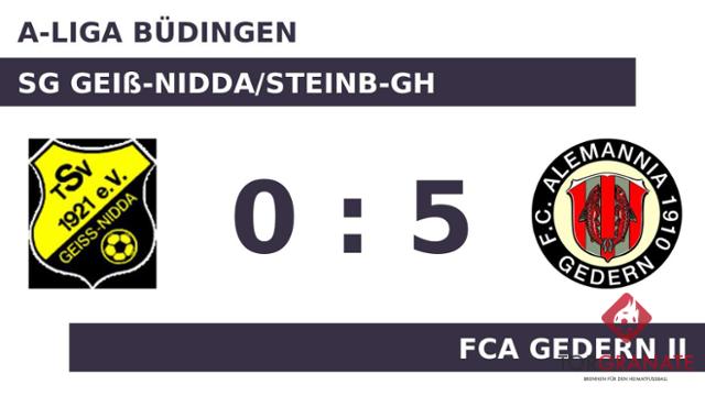 Kaum war das Spiel angepfiffen, lag der FCA Gedern II bereits in Front. Marvin Diehl markierte in der vierten Minute die Führung. Der Gast machte weiter Druck und erhöhte den Spielstand im Eilschritt durch einen Treffer von Tom Henrick Beller (6.). Mit dem 3:0 durch Simon Milanovic schien die Partie bereits in der elften Minute mit dem FCA Gedern II einen sicheren Sieger zu haben. Bis zur Pause hielt die Defensive des Geiß-Nidda/Steinb-GH dicht, sodass sich der Vorsprung des FCA Gedern II nicht weiter vergrößerte. Mit dem 4:0 von Milanovic für den FCA Gedern II war das Spiel eigentlich schon entschieden (57.). Eigentlich war die SG Geiß-Nidda/Steinb-GH schon geschlagen, als Christian Haas das Leder zum 0:5 über die Linie beförderte (63.). Mit dem Schlusspfiff durch den Unparteiischen Klaus-Jürgen Schretzlmaier (Lich) fuhr der FCA Gedern II einen Kantersieg ein, der sich schon vor der Halbzeitpause abgezeichnet hatte.