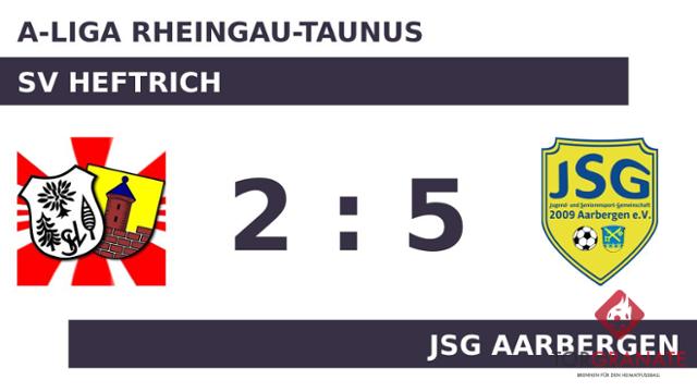 Vor dem Seitenwechsel sorgte Wim Wedel mit seinem Treffer für eine kalte Dusche für die JSG Aarbergen. Bis zum Abpfiff des ersten Durchgangs wurden keine Tore mehr geschossen und so traten die Mannschaften den Gang in die Kabinen an. Christian Michel trug sich in der 55. Spielminute in die Torschützenliste ein. Davide Santoro machte in der 58. Minute das 2:1 der JSG Aarbergen perfekt. Mustafa Metovic erhöhte den Vorsprung der JSG Aarbergen nach 65 Minuten auf 3:1. Die JSG Aarbergen musste den Treffer von Gürkan Bingöl zum 2:3 hinnehmen (68.). Innerhalb weniger Minuten trafen Metovic (75.) und Santoro (78.). Damit bewies die JSG Aarbergen nochmals die Durchschlagskraft der Offensive. Mit dem Schlusspfiff durch Schiedsrichter Ali-Ekber Sener (Frankfurt am Main) stand der Auswärtsdreier für die JSG Aarbergen. Der SV Heftrich wurde mit 5:2 besiegt.