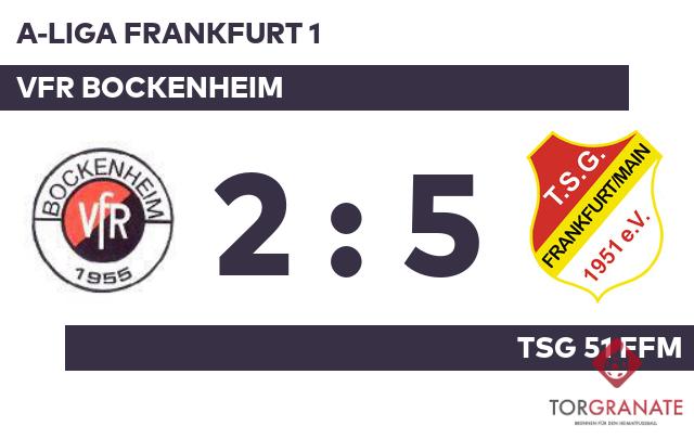 Crispin Greuner brachte den Tabellenführer in der achten Minute ins Hintertreffen. Aus der Ruhe ließ sich der Gast nicht bringen. Benedikt Burger erzielte wenig später den Ausgleich (11.). Mike-Can Cerit versenkte den Ball in der 13. Minute im Netz des VFR Bockenheim. Burger schnürte mit seinem zweiten Treffer einen Doppelpack und brachte seine Mannschaft auf die Siegerstraße (37.). Bevor es in die Pause ging, hatte Sora Shimizu noch das 2:3 des VFR Bockenheim parat (43.). Die TSG 51 Ffm nahm die knappe Führung mit in die Kabine. Für das 4:2 und 5:2 war Kai Hohmann verantwortlich. Der Akteur traf gleich zweimal ins Schwarze (49./82.). Schlussendlich reklamierte die TSG 51 Ffm einen Sieg in der Fremde für sich und wies den VFR Bockenheim mit 5:2 in die Schranken.