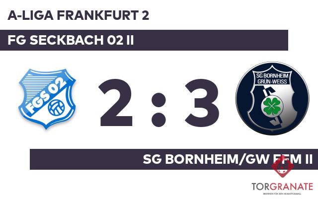 In der Anfangsphase schaffte es keines der beiden Teams, sich eine Chance zu erarbeiten. Durch einen Elfmeter von Marlon Sommerfeld gelang der SG Bornheim/GW II das Führungstor. Bis zum Halbzeitpfiff blieb der knappe Vorsprung des Ligaprimus bestehen. Anstelle von Tomislav Cudina war nach Wiederbeginn Jo Luca Haas für den Gast im Spiel. Zum Seitenwechsel ersetzte Kaan Bilgic von der FG Seckbach 02 II seinen Teamkameraden Markus Sikorski. Ali Hakemi erhöhte den Vorsprung der SG Bornheim/GW Ffm II nach 47 Minuten auf 2:0. Carl Leon Steinacker traf zum 1:2 zugunsten der FG Seckbach 02 II (64.). Hakemi schnürte mit seinem zweiten Treffer einen Doppelpack und brachte seine Mannschaft auf die Siegerstraße (67.). Es folgte der Anschlusstreffer für die FG Seckbach 02 II – bereits der zweite für Steinacker. Nun stand es nur noch 2:3 (80.). Mit Ablauf der Spielzeit schlug die SG Bornheim/GW II das Heimteam 3:2.