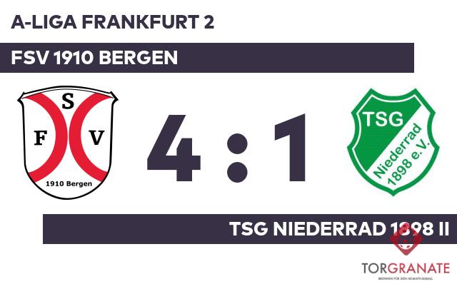 Ivan Duvnjak brachte die Gäste in der siebten Minute ins Hintertreffen. Für das 2:0 des FSV 1910 Bergen zeichnete Josh Haas verantwortlich (20.). Mit der Führung für die Gastgeber ging es in die Kabine. Zum Seitenwechsel ersetzte Hassan Benazza von der TSG Niederrad II seinen Teamkameraden Recep Erdogan. Für ruhige Verhältnisse sorgte Duvnjak, als er das 3:0 für den FSV 1910 Bergen besorgte (49.). Murat Karakus schoss die Kugel zum 1:3 für die TSG Niederrad 1898 II über die Linie (69.). Ehe der Abpfiff ertönte, war es Sharafudin Naser, der das 4:1 aus Sicht des FSV 1910 Bergen perfekt machte (90.). Nach abgeklärter Leistung blickte der FSV 1910 Bergen auf einen klaren Heimerfolg über die TSG Niederrad II.