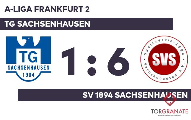 Beide Mannschaften starteten vorsichtig in das Spiel. Zu Torchancen gelangte in der Anfangsphase keine von beiden. Marcel Izzi musste nach nur 20 Minuten vom Platz, für ihn spielte Filipe Manuel Texeira Miranda weiter. Fabian Gaubatz traf zum 1:0 zugunsten des SV 1894 Sachsenhausen (33.). Kurz vor dem Halbzeitpfiff (45.) baute Jerome Schmidt die Führung der Gäste aus. Es waren die Gäste, die zur Pause eine Führung ihr Eigen nannten. Für ruhige Verhältnisse sorgte Cosimo Vasta, als er das 3:0 für den SV Sachsenhausen besorgte (53.). In der 64. Minute stellte die TG Sachsenhausen personell um: Per Doppelwechsel kamen Patrick Bub und Robert Holtz auf den Platz und ersetzten Philipp Kaplick Dahm und Daniel Burkardt. Für das 4:0 sorgte der SV Sachsenhausen in Minute 65. Dem SV 1894 Sachsenhausen gelang in der 67. Spielminute der fünften Tagestreffer. Die TG Sachsenhausen kam kurz vor dem Ende durch Marc Lauter zum Ehrentreffer (89.). Der SV Sachsenhausen überrannte die TG Sachsenhausen förmlich mit sechs Toren und fährt so mit einem verdienten Sieg in der Tasche nach Hause.