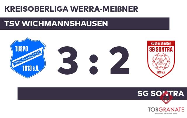 Beide Mannschaften starteten vorsichtig in das Spiel. Zu Torchancen gelangte in der Anfangsphase keine von beiden. Für das erste Tor sorgte Simon Ewald. In der 17. Minute traf der Spieler der SG Sontra ins Schwarze. Tim Klöpfel nutzte die Chance für den TSV Wichmannshausen und beförderte in der 30. Minute das Leder zum 1:1 ins Netz. Am Zwischenstand änderte sich weiter nichts, sodass dieser auch gleichzeitig der Pausenstand war. Julian Schreiber verwandelte in der 50. Minute einen Elfmeter und brachte dem Wichmannshausen die 2:1-Führung. Das 2:2 der SG Sontra bejubelte Kevin Windus (76.). Gefeierter Mann des Spiels war Klöpfel, der dem TSV Wichmannshausen mit seinem Treffer in der 90. Minute den Vorsprung brachte. In den 90 Minuten war die Heimmannschaft im gegnerischen Strafraum erfolgreicher als die SG Sontra und fuhr somit einen 3:2-Sieg ein.