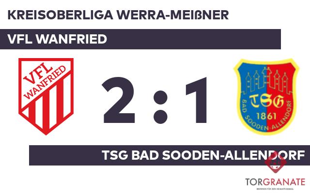 In der Anfangsphase schaffte es keines der beiden Teams, sich eine Chance zu erarbeiten. Steffen Faber musste nach nur 19 Minuten vom Platz, für ihn spielte Julian Thomas weiter. Für den Führungstreffer von Sooden-Allendorf zeichnete Calvin Schimpf verantwortlich (39.). Der Gast nahm die knappe Führung mit in die Kabine. In Durchgang zwei lief Marlon Henze anstelle von Christian Tomas für die TSG Bad Sooden-Allendorf auf. Der VfL Wanfried kam durch ein Eigentor von Sooden-Allendorf in der 53. Minute zum Ausgleich. Das 2:1 des VfL Wanfried bejubelte Wilhelm Löffler (78.). Nach Beendigung der zweiten Halbzeit hieß das Ergebnis 2:1 zugunsten der Heimmannschaft.