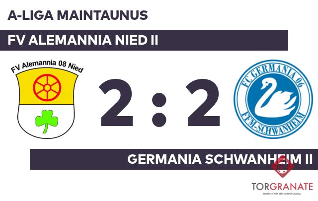 Der FV Alemannia Nied II erwischte einen Blitzstart ins Spiel. Carmine Di Lauro traf in der sechsten Minute zur frühen Führung. Bis zur Halbzeitpause konnte keine der Mannschaften ihre Torbilanz mehr verbessern. Eren Öz, der von der Bank für Elias Fannich kam, sollte für neue Impulse bei der Germ. Schwanheim II sorgen (54.). Youssef El Madih erhöhte für den FV Alemannia Nied II auf 2:0 (66.). Öz schlug doppelt zu und glich damit für die Germania Schwanheim II aus (73./90.). Gedanklich hatte der FV Alemannia Nied II den Sieg bereits sicher, doch eine famose Aufholjagd sicherte den Gästen am Ende noch den Teilerfolg.