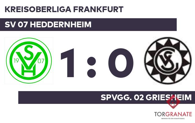Nach den ersten 45 Minuten ging es für den SV 07 Heddernheim und die Spvgg. 02 Griesheim ohne Torerfolg in die Kabinen. Oliver Solarz brachte sein Team in der 52. Minute nach vorn. Die Luft bei der Spvgg. 02 Griesheim war in der Folge raus, was sich auch am Platzverweis von Michael Ofosu bemerkbar machte, der in der 86. Minute mit Gelb-Rot vom Feld flog. Nach Beendigung der zweiten Halbzeit hieß das Ergebnis 1:0 zugunsten des SV 07 Heddernheim.