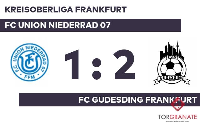 Alexander Felten brachte den FC Gudesding in der 35. Minute ins Hintertreffen. Den Freudenjubel des FC Union Niederrad 07 machte Alexander Root zunichte, als er kurz darauf den Ausgleich besorgte (38.). In Durchgang zwei lief Zvonimir Matkovic anstelle von Aminur Rahman für den Gastgeber auf. Der Schiedsrichter schickte schließlich beide Mannschaften ohne weitere Änderung am Spielstand in die Kabinen. Der Treffer zum 2:1 sicherte dem FC Gudesding Frankfurt nicht nur die Führung – es war auch bereits der zweite von Root in diesem Spiel (56.). Mit dem Schlusspfiff durch Schiedsrichter Cevat Kalyoncu (Hattersheim am Main) siegte der Gast gegen den FC Union Niederrad.