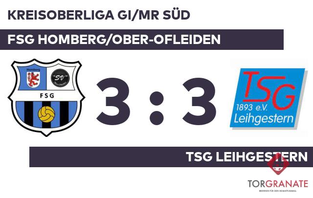 Auf die vermeintliche Siegerstraße brachte Tuncay Kepenek sein Team in der 20. Minute. Nico Pfeiffer musste nach nur 20 Minuten vom Platz, für ihn spielte Lukas Heidt weiter. Für das 1:1 der TSG Leihgestern zeichnete Tom Schäfer verantwortlich (29.). Ohne dass sich am Stand noch etwas geändert hatte, verabschiedeten sich beide Mannschaften zur Pause in die Kabinen. Demir Cokovic schoss für das Homberg/Ober-Ofl. in der 54. Minute das zweite Tor. Die TSG Leihgestern hatte sich schnell wieder gesammelt und erzielte in Person von Christoph Dietrich den Ausgleich (58.). Per Elfmeter erhöhte Cokovic in der 85. Minute seine Torausbeute an diesem Tag auf zwei Treffer – 3:2 für die FSG Homberg/Ober-Ofleiden. Als einige Zuschauer bereits die Gastgeber als Sieger der Begegnung sahen, schlug der Moment von Daniel Weber, der zum Ausgleich traf (90.). Letztlich gingen das Homberg/Ober-Ofl. und die TSG Leihgestern mit jeweils einem Punkt auseinander.