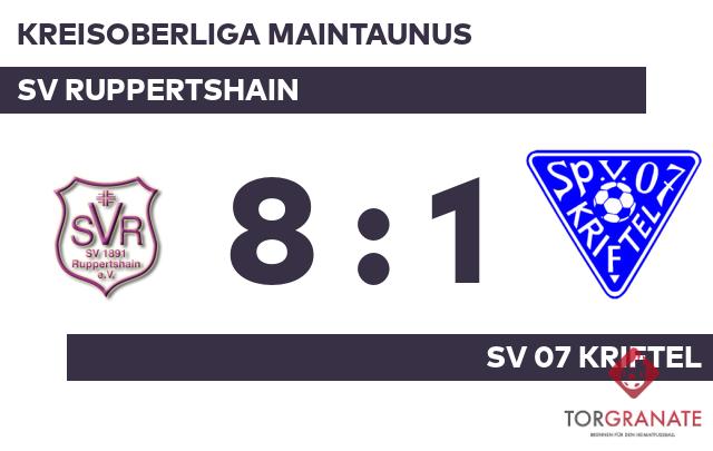 Luka Hager brachte den SV Ruppertshain in der 14. Spielminute in Führung. Leonardo Bianco versenkte die Kugel zum 2:0 für den SV Ruppertshain (17.) Das 3:0 für den SV Ruppertshain stellte Hager sicher. In der 36. Minute traf er zum zweiten Mal während der Partie. Der Halbzeitpfiff war noch nicht ertönt, als Bianco seinen zweiten Treffer nachlegte (42.). Der SV Ruppertshain dominierte den Gegner zur Pause nach Belieben und ging mit einer deutlichen Führung in die Kabine. Mit dem Tor zum 5:0 steuerte Bianco bereits seinen dritten Treffer an diesem Tag bei (47.). Vom Elfmeterpunkt erzielte Mohamed Elbay den Ehrentreffer für den SV 07 Kriftel (55.). Der SV Ruppertshain baute den Vorsprung mit der Hilfe des Gegners weiter aus: 6:1 für den SV Ruppertshain durch ein Eigentor des SV 07 Kriftel in der 56. Minute. Willi Stoll vollendete zum achten Tagestreffer in der 60. Spielminute. Letztlich kam der SV Ruppertshain gegen den SV 07 Kriftel zu einem verdienten 8:1-Sieg.