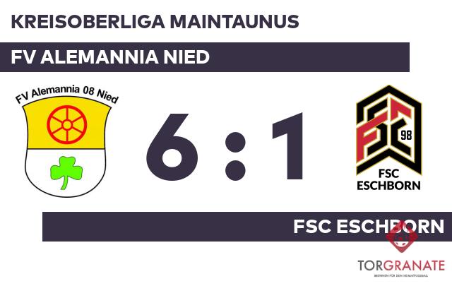 Eugen Schwarz brachte den FSC Eschborn per Doppelschlag ins Hintertreffen, als er in der 27. und 45. Minute vollstreckte. Mit der Führung für den FV Alemannia Nied ging es in die Halbzeitpause. Beim FSC Eschborn kam zu Beginn der zweiten Hälfte Kadir Özen für Abdulkadir Sagir in die Partie. Tarik Choukairi legte in der 48. Minute zum 3:0 für den FV Alemannia Nied nach. Für den nächsten Erfolgsmoment der Gastgeber sorgte Vladan Albijanic (52.), ehe Aleksandar Simic das 5:0 markierte (76.). In der Schlussphase gelang Bilal Taadou noch der Ehrentreffer für den FSC Eschborn (83.). Den Vorsprung des FV Alemannia Nied ließ Albijanic in der 85. Minute anwachsen. Letztlich feierte der FV Alemannia Nied gegen den FSC Eschborn nach einer überzeugenden Darbietung einen verdienten Heimsieg.