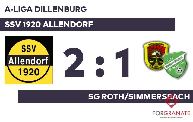 Kaum war das Spiel angepfiffen, lag der SSV 1920 Allendorf bereits in Front. Damian Pyrek markierte in der vierten Minute die Führung. Zum Abpfiff der ersten Halbzeit hatte der SSV 1920 Allendorf einen knappen Vorsprung herausgespielt. Marc Buchen, der von der Bank für Christian Pfeiffer kam, sollte für neue Impulse bei der SG Roth/Simmersbach sorgen (55.). In der 69. Minute brachte Buchen den Ball im Netz des SSV 1920 Allendorf unter. Lars Thomas, der für Sercan Ece in die Partie kam, sollte die Offensive des SSV 1920 Allendorf beleben (72.). Dank eines Treffers von Thomas in der Schlussphase (87.) gelang es dem SSV 1920 Allendorf, die Führung einzufahren. Zum Schluss feierte der SSV 1920 Allendorf einen dreifachen Punktgewinn gegen die SG Roth/Simmersbach.
