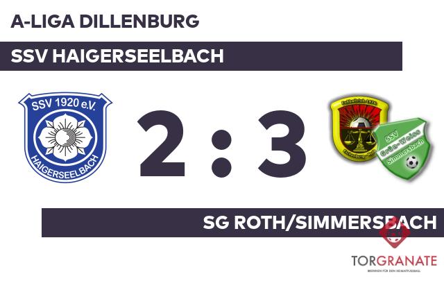 Für das erste Tor sorgte Lorenz Bastian. In der siebten Minute traf der Spieler der SG Roth/Simmersbach ins Schwarze. Tobias Reeh musste nach nur 20 Minuten vom Platz, für ihn spielte Dennis Kretz weiter. Für das erste Tor des SSV Haigerseelbach war Jason Konopka verantwortlich, der in der 24. Minute das 1:1 besorgte. Das letzte Tor der turbulenten Startphase markierte Nico Voss in der 30. Minute. Bis zum Halbzeitpfiff blieb der knappe Vorsprung des SSV Haigerseelbach bestehen. Ibrahim Oenlue traf zum 2:2 zugunsten der SG Roth/Simmersbach (57.). Marc Buchen stellte für die Gäste im Schlussakt den Führungstreffer sicher (86.). Am Ende nahm die SG Roth/Simmersbach beim SSV Haigerseelbach einen Auswärtssieg mit.