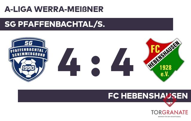 Hebenshausen ging durch Lasse Blank in der 22. Minute in Führung. Pfaffenbachtal/S. hatte sich schnell wieder gesammelt und erzielte in Person von Tobias Wetzel den Ausgleich (26.). Mark Schalansky beförderte das Leder zum 2:1 des FC Hebenshausen in die Maschen (38.). Mund abputzen und weitermachen: Unter diesem Motto stand der Ausgleich, den Max Schimanski bereits wenig später besorgte (39.). Zur Halbzeit war die Partie noch vollkommen offen. Remis lautete das Zwischenresultat. Mit einem schnellen Doppelpack (50./53.) zum 4:2 schockte Schimanski Hebenshausen. Christian Richter ließ sich in der 55. Minute nicht zweimal bitten und verwertete zum 3:4 für den Gast. Die SG Pfaffenbachtal/S. musste den Treffer von Ole Brüchmann zum 4:4 hinnehmen (77.). Letztlich gingen die Gastgeber und der FC Hebenshausen mit jeweils einem Punkt auseinander.