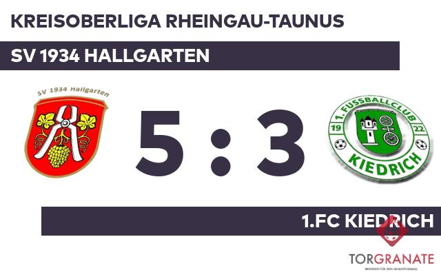 Alessio Desio brachte die Gäste in der achten Minute ins Hintertreffen. In der 17. Minute brachte Tobias Kliemt das Netz für den SV 1934 Hallgarten zum Zappeln. Marco Proksch legte in der 21. Minute zum 3:0 für die Heimmannschaft nach. Der 1.FC Kiedrich verkürzte den Rückstand in der 28. Minute durch einen Elfmeter von Laurenz Rheingans auf 1:3. Das 4:1 für den SV 1934 Hallgarten stellte Kliemt sicher. In der 38. Minute traf er zum zweiten Mal während der Partie. Kurz vor dem Halbzeitpfiff (45.) baute Christopher Hofmann die Führung des SV 1934 Hallgarten aus. Zur Halbzeit blickte der SV 1934 Hallgarten auf einen klaren Vorsprung gegen einen Gegner, den man deutlich beherrschte. Marcel Burkhardt war zur Stelle und markierte das 3:5 des 1.FC Kiedrich (49.). Obwohl dem SV 1934 Hallgarten nach erfolgreicher erster Hälfte keine weiteren Tore gelangen, schaffte es der 1.FC Kiedrich zugleich nicht, die Partie zu drehen. Sie endete mit 5:3.