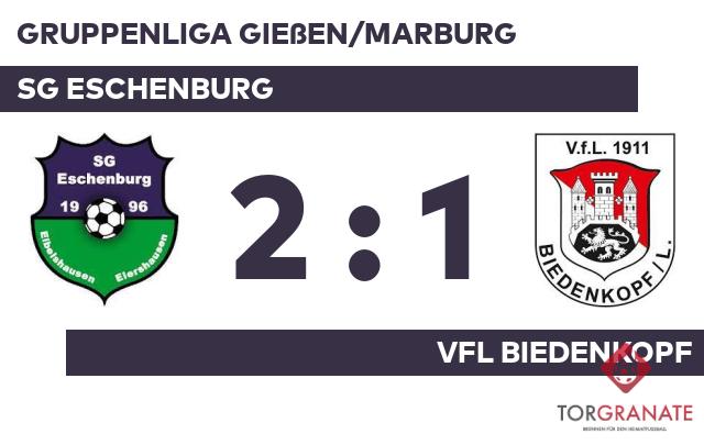 Benyamin Sabau brachte den VfL Biedenkopf in der zehnten Minute ins Hintertreffen. Nicolai Herrmann beförderte das Leder zum 1:1 der Gäste in die Maschen (31.). Jan Reiprich nutzte die Chance für die SG Eschenburg und beförderte in der 35. Minute das Leder zum 2:1 ins Netz. Zur Pause behielt die Heimmannschaft die Nase knapp vorn. Obwohl der SG Eschenburg nach erfolgreicher erster Hälfte keine weiteren Tore gelangen, schaffte es der VfL Biedenkopf zugleich nicht, die Partie zu drehen. Sie endete mit dem Halbzeitstand von 2:1.