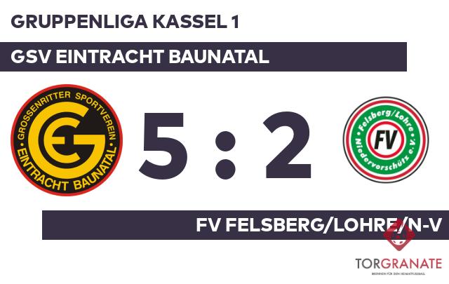 Sebastian Kraus versenkte die Kugel zum 1:0 (13.). Für das erste Tor von Eintracht Baunatal war Maximilian Norwig verantwortlich, der in der 23. Minute das 1:1 besorgte. Kurz vor dem Pfiff zur Halbzeit machte Abdullah Al Omari das 2:1 zugunsten des GSV (41.). Zur Pause war die Eintracht im Fahrwasser und verbuchte eine knappe Führung. Für den nächsten Erfolgsmoment der Großenritter sorgte Oliver Schweitzer (62.), ehe Kevin Kutzner das 4:1 markierte (73.). In der 77. Minute brachte Enes Karasoy das Netz für den FV Felsberg/Lohre/N-V zum Zappeln. Andreas Bürger stellte schließlich in der 80. Minute den 5:2-Sieg für den GSV Eintracht Baunatal sicher. Nach der Beendigung des Spiels durch Referee Daniel Losinski (Immenhausen) feierten die Baunataler einen dreifachen Punktgewinn gegen den FV Felsberg/L/N-V.