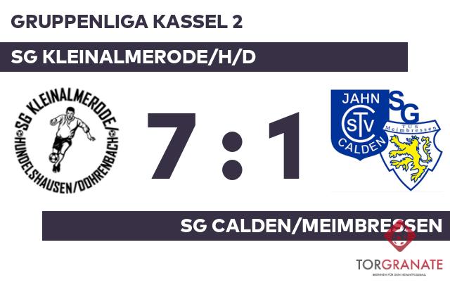 Die SG Kleinalmerode/H/D erwischte einen Blitzstart ins Spiel. Johannes Jank traf in der vierten Minute zur frühen Führung. Die SG Calden/Meimbressen zeigte sich wenig beeindruckt. In der neunten Minute schlug Jannis Weis mit dem Ausgleich zurück. Özkan Beyazit brachte der SG Kleinalmerode/H/D nach elf Minuten die 2:1-Führung. Zum psychologisch ungünstigen Zeitpunkt vor der Halbzeit (45.) schoss Rinor Murati einen weiteren Treffer für den Gastgeber. Mit der Führung für die SG Kleinalmerode/H/D ging es in die Kabine. Die SG Kleinalmerode/H/D baute die Führung aus, indem Murati zwei Treffer nachlegte (58./70.). Durchsetzungsstark zeigte sich die SG Kleinalmerode/H/D, als Alexander Bazzone (78.) und Rene Weska (86.) schnell nacheinander im gegnerischen Strafraum zuschlugen. Schlussendlich verbuchte die SG Kleinalmerode/H/D gegen die Calden/Meimbressen einen überzeugenden Heimerfolg.