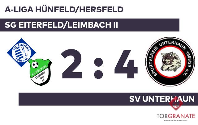 Die SG Eiterfeld/Leimbach II findet sich derzeit in der unteren Tabellenhälfte wieder: Rang elf. In dieser Saison sammelte die SG Eiterfeld/Leimbach II bisher vier Siege und kassierte acht Niederlagen. Die Lage von Eiterf./Leimbach II bleibt angespannt. Gegen den SV Unterhaun musste man zum zweiten Mal in Folge die Punkte abgeben.