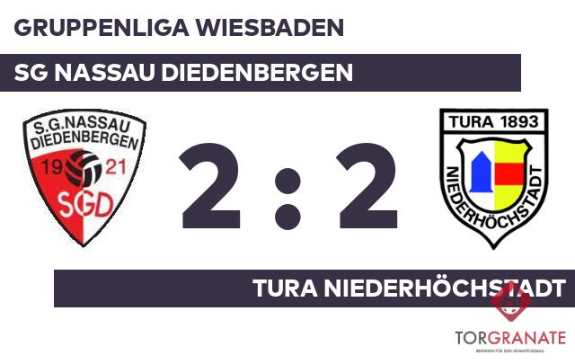 Timo Grünewald brachte das Nassau Diedenbergen in der 14. Minute in Front. In der 28. Minute erzielte Yannick Fischer das 1:1 für den TuRa Niederhöchstadt. Nach nur 29 Minuten verließ Jan Willeitner von der SG Nassau Diedenbergen das Feld, Tom Korominas kam in die Partie. Dominik Conan brachte den Ball zum 2:1 zugunsten des TuRa Niederhöchstadt über die Linie (38.). Ein Tor auf Seiten des Gasts machte zur Pause den Unterschied zwischen den beiden Mannschaften aus. Marcel Friedrich schoss für das Nassau Diedenbergen in der 51. Minute das zweite Tor. Letzten Endes wurde in der Begegnung des Gastgebers mit dem TuRa Niederhöchstadt kein Sieger gefunden.