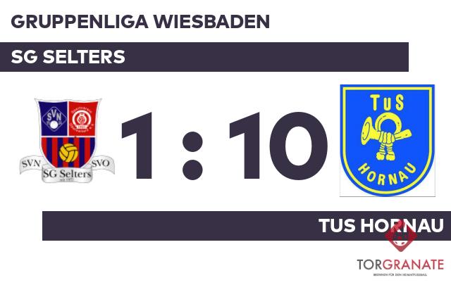 Durch einen Elfmeter von Felix Erbe gelang dem Gast das Führungstor. Lukas Wintermeier versenkte die Kugel zum 2:0 für die TuS Hornau (26.). Maxim Andreutti schraubte das Ergebnis in der 31. Minute mit dem 3:0 für die TuS Hornau in die Höhe. Das 4:0 für die TuS Hornau stellte Erbe sicher. In der 35. Minute traf er zum zweiten Mal während der Partie. Der dominante Vortrag der TuS Hornau im ersten Spielabschnitt zeigte sich an der deutlichen Halbzeitführung. Mit einem Wechsel – Philipp Freppon kam für Marvin Annecke Petri – startete die SG Selters in Durchgang zwei. Paul Riley (62.), Paulo Matos Costa (64.) und Tim Claas (65.) bauten die komfortable Führung der TuS Hornau weiter aus. Für die SG Selters war es ein Tag zum Vergessen. Dennis Frank (66.), Claas (74.) und Wintermeier (79.) machten das Unheil perfekt. Justin Wolter erzielte in der 66. Minute den Ehrentreffer für den Tabellenletzten. Schließlich war auch der Torrausch der TuS Hornau vorbei und die SG Selters in Einzelteile zerlegt.