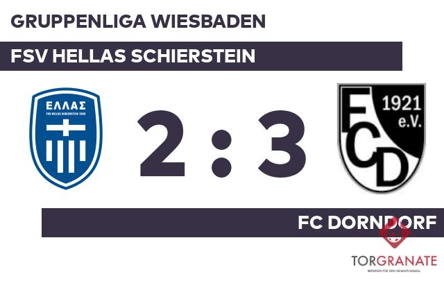 Vor dem Seitenwechsel sorgte Athanasios Nakos mit seinem Treffer für eine kalte Dusche für den FC Dorndorf. Das Hellas Schierstein führte zur Halbzeit knapp mit einem Tor Vorsprung. Bei den Gastgebern kam Sabri El Funte für Redouane Morchid ins Spiel und sollte fortan für neue Impulse sorgen (59.). Florian Kröner sicherte der Dorndorf nach 61 Minuten den Ausgleich durch einen Elfmeter. El Funte brachte dem FSV Hellas Schierstein nach 82 Minuten die 2:1-Führung. In der 89. Minute war Kröner mit dem Ausgleich zum 2:2 zur Stelle. Damit schoss er bereits seinen zweiten Treffer! Der Schlusspfiff war zum Greifen nah, als Fabio Dahlem noch einen Treffer parat hatte (90.). Letzten Endes ging der FC Dorndorf im Duell mit dem Hellas Schierstein als Sieger hervor.