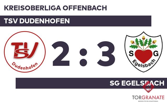 Kaum war das Spiel angepfiffen, lag der TSV Dudenhofen bereits in Front. Marco Mueller markierte in der zweiten Minute die Führung. Bereits in der 15. Minute erhöhte Brian Hrbaty den Vorsprung der Heimmannschaft. Marcel Riemer musste nach nur 20 Minuten vom Platz, für ihn spielte Tom Rösner weiter. Till Herchenhahn schlug doppelt zu und glich damit für die SG Egelsbach aus (25./27.). Bis zum Abpfiff des ersten Durchgangs wurden keine Tore mehr geschossen und so traten die Mannschaften den Gang in die Kabinen an. Jonas Walter verwandelte in der 75. Minute einen Elfmeter und brachte der SG Egelsbach die 3:2-Führung. Die Zeichen standen auf Sieg für den TSV Dudenhofen, doch gab man eine sichere Führung aus der Hand und kassierte letztlich eine bittere Niederlage.