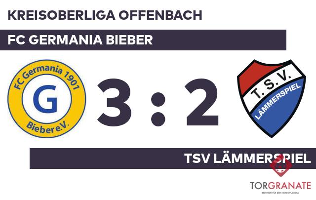 Der FC Germania Bieber erwischte einen Blitzstart ins Spiel. Mohamed Boulahfa traf in der zweiten Minute zur frühen Führung. Am Zwischenstand änderte sich weiter nichts, sodass dieser auch gleichzeitig der Pausenstand war. In der 47. Minute verwandelte Airidas Butkus einen Elfmeter zum 1:1 für den TSV Lämmerspiel. Marco Schaub war zur Stelle und markierte das 2:1 der Gäste (52.). Das 2:2 des FC Germania Bieber stellte Denis Smisek sicher (70.). Der Ligaprimus ging mit einem Elfmeter von Francesco Petrovic in Führung (75.). Als Schiedsrichter Marius Ulbrich (Büdingen) die Partie abpfiff, reklamierte der Gastgeber schließlich einen 3:2-Heimsieg für sich.