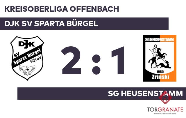 Das erste Tor des Spiels ging an die SG Heusenstamm. Allerdings gelang dies nur mithilfe des DJK SV Sparta Bürgel: 1:0 für die SG Heusenstamm durch ein Eigentor in der 42. Minute. Ein Tor auf Seiten der SG Heusenstamm machte zur Pause den Unterschied zwischen den beiden Mannschaften aus. In Durchgang zwei lief Gianluca Skeledzic anstelle von Nikola Satora für die Gäste auf. Das 1:1 des DJK SV Sparta Bürgel stellte Marin Kristo sicher (61.). Denis Osmanagic wurde zum Helden des Spiels, als er das Heimteam mit einem Treffer kurz vor dem Abpfiff (86.) doch noch in Front brachte. Schließlich strich der DJK SV Sparta Bürgel die Optimalausbeute gegen die SG Heusenstamm ein.