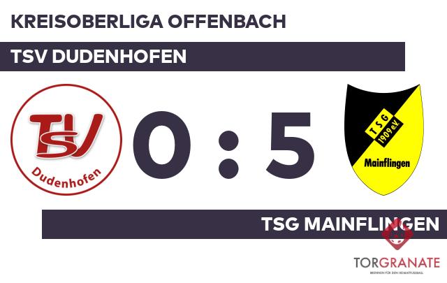 Der Gast legte los wie die Feuerwehr und ließ durch einen Doppelschlag von Andrej Kolchak aufhorchen (3./11.). Die TSG Mainflingen baute den Vorsprung mit der Hilfe des Gegners weiter aus: 3:0 für die TSG Mainflingen durch ein Eigentor des TSV Dudenhofen in der 25. Minute. Nach nur 28 Minuten verließ Ruan Sonnen vom TSV Dudenhofen das Feld, Marco Mueller kam in die Partie. Mit dem 4:0 von Jean Schäfer für die TSG Mainflingen war das Spiel eigentlich schon entschieden (35.). Mit einer deutlichen Führung der TSG Mainflingen ging es in die Halbzeitpause. Die TSG Mainflingen konnte mit dem ersten Durchgang sehr zufrieden sein. Trotzdem gab es Veränderungen bei der TSG Mainflingen. Alexey Kolchak ersetzte Robin Paul Weiher, der nun schon vorzeitig Feierabend machte. Zum Seitenwechsel ersetzte Brian Hrbaty vom TSV Dudenhofen seinen Teamkameraden Paul Danut Geana. Alexey Kolchak besorgte in der Schlussphase schließlich den fünften Treffer für die TSG Mainflingen (71.). Schiedsrichter Mike Busch (Hanau) beendete schließlich das Spiel und somit kassierte der TSV Dudenhofen eine schmerzliche Niederlage gegen einen direkten Konkurrenten im Abstiegskampf.