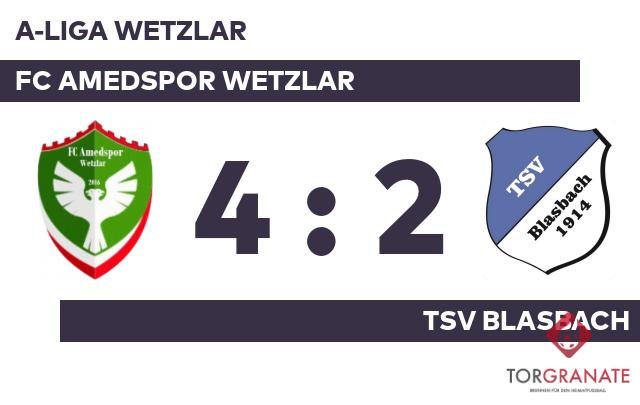 Der FC Amedspor Wetzlar geriet schon in der achten Minute in Rückstand, als Emre Geyik das schnelle 1:0 für den TSV Blasbach erzielte. Serat Yildiz war es, der in der 16. Minute den Ball im Tor des TSV Blasbach unterbrachte. Deniz Günes verwandelte in der 40. Minute einen Elfmeter und brachte dem Amedspor Wetzlar die 2:1-Führung. Die Heimmannschaft hatte zur Pause eine knappe Führung auf dem Zettel stehen. In der 77. Minute war Geyik mit dem Ausgleich zum 2:2 zur Stelle. Damit schoss er bereits seinen zweiten Treffer! Vier Minuten später ging der FC Amedspor Wetzlar durch den zweiten Treffer von Günes in Führung. Oezguer Yasa Keleci stellte wenige Minuten vor dem Schlusspfiff den Stand von 4:2 für das Amedspor Wetzlar her (87.). Schließlich sprang für den FC Amedspor Wetzlar gegen den TSV Blasbach ein Dreier heraus.
