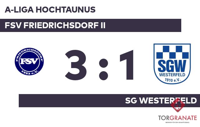 Christian Sic brachte den FSV Friedrichsdorf II in der 35. Minute in Front. Kurz vor dem Pausenpfiff erhöhte Paul Goehsing den Vorsprung des Heimteams auf 2:0 (43.). Mit der Führung für das Friedrichsdorf II ging es in die Kabine. Bei der SG Westerfeld kam zu Beginn der zweiten Hälfte Ahmet Demir für Milad Hashemi in die Partie. Nach der erfolgreichen ersten Hälfte schickte der FSV Friedrichsdorf II mit Tuna Guenay einen frischen Spieler für Julien Smith auf das Feld. In der 56. Minute verwandelte Steffen Fuchs einen Elfmeter zum 3:0 für das Friedrichsdorf II. Für das 1:3 der SG Westerfeld zeichnete Timon Dunkel verantwortlich (74.). Nach Beendigung der zweiten Halbzeit hieß das Ergebnis 3:1 zugunsten des FSV Friedrichsdorf II.