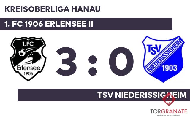 Ein Doppelpack brachte den 1. FC Erlensee II in eine komfortable Position: Dorian Ahouandyinou war gleich zweimal zur Stelle (19./29.). Nach nur 24 Minuten verließ Daniel Ebell vom TSV Niederissigheim das Feld, Hendrik Swasey kam in die Partie. Weitere Tore gab es bis zum Pausenpfiff nicht und so ging es mit der Führung des 1. FC 1906 Erlensee II in die Kabine. Jona Spindler brachte das Heimteam in ruhiges Fahrwasser, indem er das 3:0 erzielte (57.). Letztlich fuhr der 1. FC Erlensee II einen souveränen Erfolg ein, dessen Grundstein im ersten Spielabschnitt gelegt worden war.