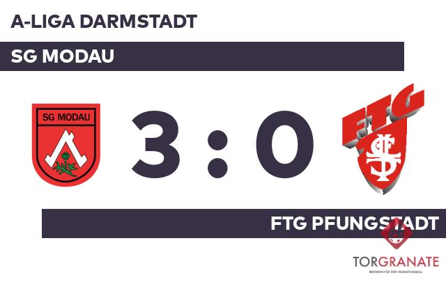 Timo Mertz schoss für die Gastgeber in der 14. Minute das erste Tor. Für Philipp Tachtler war der Einsatz nach 14 Minuten vorbei. Für ihn wurde Philipp Eicke eingewechselt. Pedro Araujo da Silva schoss die Kugel zum 2:0 für die SG Modau über die Linie (36.). Mit der Führung für die SG Modau ging es in die Kabine. Mit einem Wechsel – Darwin Zissel kam für Muhammed Deniz – startete die FTG Pfungstadt in Durchgang zwei. Die SG Modau baute den Vorsprung mit der Hilfe des Gegners weiter aus: 3:0 für die SG Modau durch ein Eigentor der FTG Pfungstadt in der 49. Minute. Schlussendlich verbuchte die SG Modau gegen die FTG Pfungstadt einen überzeugenden 3:0-Heimerfolg.