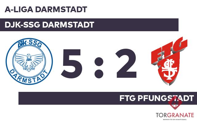 Vor dem Seitenwechsel sorgte Marius Schmeller mit seinem Treffer für eine kalte Dusche für die FTG Pfungstadt. Mit einem Tor Vorsprung für den DJK-SSG Darmstadt ging es für die beiden Teams in die Halbzeitpause. In der 48. Minute erhöhte Luka Kausche auf 2:0 für den Tabellenletzten. Cedrik Korn überwand den gegnerischen Schlussmann zum 3:0 für die Gastgeber (55.). Durchsetzungsstark zeigte sich die FTG Pfungstadt, als Dominic Heil (70.) und Felix Kai Breiner (79.) schnell nacheinander im gegnerischen Strafraum zuschlugen. Doppelpack für den DJK-SSG Darmstadt: Nach seinem ersten Tor (83.) markierte Yves Hartmann wenig später seinen zweiten Treffer (86.). Am Schluss fuhr der DJK-SSG Darmstadt gegen die FTG Pfungstadt auf eigenem Platz einen Sieg ein.