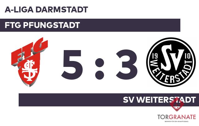 Die Heimmannschaft erwischte einen Blitzstart ins Spiel. Leon Kalilou Daffè traf in der fünften Minute zur frühen Führung. Jetzt erst recht, dachte sich Muhammed Arkan, der kurz nach dem Nackenschlag den Ausgleich parat hatte (9.). Der SV Weiterstadt ging durch einen Elfmeter von Wolfgang Mahr in Führung (12.). Nach nur 28 Minuten verließ Muhammed Deniz von der FTG Pfungstadt das Feld, Antonio Sabatino kam in die Partie. Der SV Weiterstadt musste den Treffer von Anatoli Larkowitsch zum 2:2 hinnehmen (36.). Zur Halbzeit war die Partie noch vollkommen offen. Remis lautete das Zwischenresultat. Innerhalb weniger Minuten trafen Florian Kramer (49.) und Kevin Knauer (53.). Damit bewies die FTG Pfungstadt nochmals die Durchschlagskraft der Offensive. Patrick Bortz beförderte das Leder zum 3:4 des SV Weiterstadt in die Maschen (87.). Karim Saadan stellte wenige Minuten vor dem Schlusspfiff den Stand von 5:3 für die FTG Pfungstadt her (90.). Am Ende stand die FTG Pfungstadt als Sieger da und behielt die drei Punkte verdient zu Hause.
