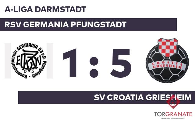 Jure Markota trug sich in der 38. Spielminute in die Torschützenliste ein. Zur Pause war der SV Croatia Griesheim im Fahrwasser und verbuchte eine knappe Führung. Mit einem schnellen Hattrick (48./50./58.) zum 4:0 schockte David Bikic den RSV Ger. Pfungstadt. Der SV Croatia Griesheim baute den Vorsprung mit der Hilfe des Gegners weiter aus: 5:0 für den Gast durch ein Eigentor des RSV Germania Pfungstadt in der 61. Minute. In der 65. Minute stellte der SV Croatia Griesheim personell um: Per Doppelwechsel kamen Fatih Uysal und Dominik Bralic auf den Platz und ersetzten Goran Mulac und Elemin Bihorcic. Gordon Choynowski erzielte in der 70. Minute den Ehrentreffer für den RSV Ger. Pfungstadt. Mit dem Schlusspfiff durch den Unparteiischen Manfred Stegmüller (Erbach) gewann der SV Croatia Griesheim gegen den RSV Germania Pfungstadt.