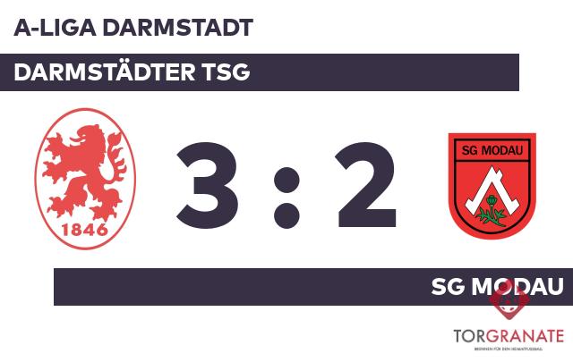 Pedro Araujo da Silva brachte die SG Modau in der 17. Minute nach vorn. Wer glaubte, die Darmstädter TSG sei geschockt, irrte. Alexander Voglis machte unmittelbar nach dem Rückschlag den Ausgleich perfekt (22.). Tobias Schmidtner stellte die Weichen für das Heimteam auf Sieg, als er in Minute 31 mit dem 2:1 zur Stelle war. Die Pausenführung der Darmstädter TSG fiel knapp aus. Die Darmstädter TSG musste den Treffer von Konstantin Becker zum 2:2 hinnehmen (47.). Der Treffer zum 3:2 sicherte der Darmstädter TSG nicht nur die Führung – es war auch bereits der zweite von Voglis in diesem Spiel (74.). Mit dem Schlusspfiff durch Schiedsrichter Steffen Bieber (Friedberg (Hessen)) siegte die Darmstädter TSG gegen die SG Modau.