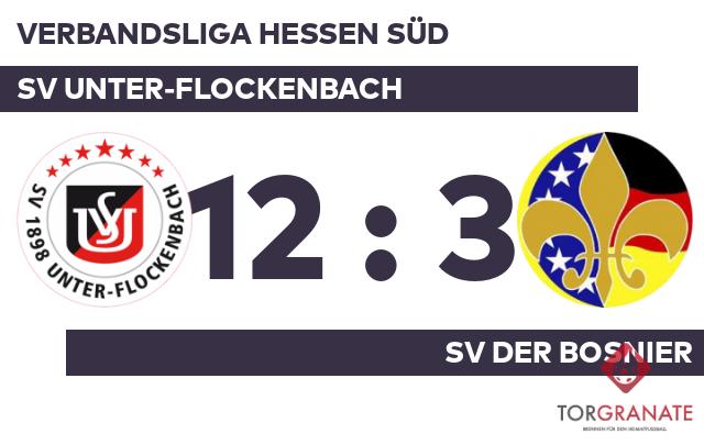 Kaum war das Spiel angepfiffen, lag der SV Unter-Flockenbach bereits in Front. Lotfi Graidia markierte in der dritten Minute die Führung. Der Ligaprimus machte weiter Druck und erhöhte den Spielstand im Eilschritt durch einen Treffer von Linus Hebling (8.). Kodai Hayashi verkürzte für den SV der Bosnier später in der 21. Minute auf 1:2. Nach nur 30 Minuten verließ Tim Hochlenert vom SV Unter-Flockenbach das Feld, Marius Kamuff kam in die Partie. Hebling (34.) und Fabio Hechler (39.) trafen innerhalb weniger Minuten zur Vorentscheidung des Gastgebers. Die beiden Mannschaften verabschiedeten sich schließlich mit der deutlichen Führung für die Elf von Mirko Schneider in die Pause. Husein Velagic schickte Matej Rugle aufs Feld. Mohamed Abdullahi Mohamud blieb in der Kabine. Der SV Unter-Flockenbach baute die Führung aus, indem Chris Diefenbach zwei Treffer nachlegte (48./49.). Der siebte Streich des SV Unter-Flockenbach war Nico Hammann vorbehalten (59.). Mit dem Treffer zum 2:7 in der 65. Minute machte Hayashi zwar seinen Doppelpack perfekt – der Rückstand zum SV Unter-Flockenbach war jedoch weiterhin gewaltig. Das 8:2 für den SV Unter-Flockenbach stellte Hebling sicher. In der 69. Minute traf er zum dritten Mal während der Partie. Graidia schraubte das Ergebnis in der 78. Minute mit dem 9:2 für den SV Unter-Flockenbach in die Höhe. Hayashi versenkte den Ball in der 80. Minute im Netz des SV Unter-Flockenbach. Mit weiteren Toren von Hebling (84.), Niclas Blüm (87.) und Diefenbach (90.) stellte der SV Unter-Flockenbach den Stand von 12:3 her. Mit dem Schlusspfiff hatte der SV der Bosnier das Martyrium überstanden und war mit 3:12 geschlagen.