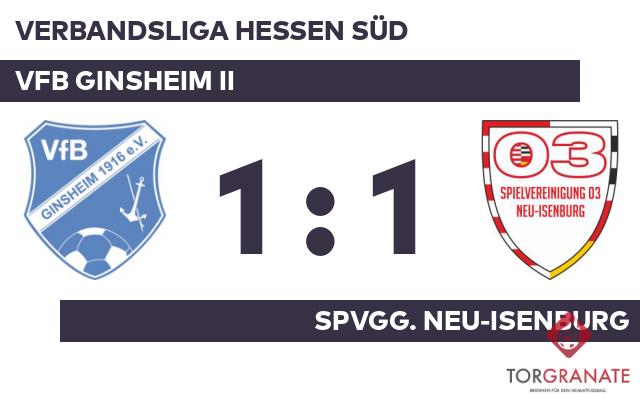 Für das 1:0 der Spielvereinigung Neu-Isenburg zeichnete Gabriel Fustero verantwortlich (9.). In der Zeit bis zur Pause fiel kein weiteres Tor, es blieb bei der Führung für die Neu-Isenburger. In der 78. Minute erzielte Nazeem Aboubakari das 1:1 für den VfB Ginsheim II. Um mehr Durchschlagskraft im Angriff zu haben, brachte Andreas Haffner in der 85. Minute den nominellen Stürmer Marc Züge für den etatmäßigen Defensivmann Paul Bickel. Letzten Endes wurde im Aufeinandertreffen des VfB Ginsheim II mit der Spvgg. Neu-Isenburg kein Sieger ermittelt.