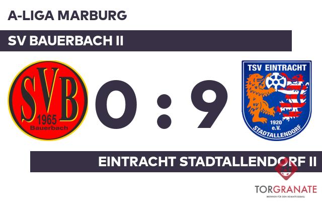 Diego Gioacchino Lamm brachte den TSV Eintracht II in der 38. Minute in Front. Zum psychologisch ungünstigen Zeitpunkt vor der Halbzeit (43.) schoss Jerome Kaufmann einen weiteren Treffer für die Gäste. Kurz vor dem Halbzeitpfiff (45.) baute Kevin Dippel die Führung der Eintracht Stadtallendorf II aus. Der TSV Eintracht II dominierte den Gegner zur Pause nach Belieben und ging mit einer deutlichen Führung in die Kabine. Dippel gelang ein Doppelpack (54./60.), mit dem er das Ergebnis auf 5:0 hochschraubte. Dass es ein ungleiches Duell war, demonstrierten Kaufmann (70.), Dippel (72.) und Marius Heckendorf (75.), die weitere Treffer für die Eintracht Stadtallendorf II folgen ließen. Wenig später kamen Heckendorf und Hassan Hashem per Doppelwechsel für Kaufmann und Lamm auf Seiten des TSV Eintracht II ins Match (72.). Dippel führte sein Team heute beinahe im Alleingang zum Erfolg: Mit dem 9:0 war er schon das fünfte Mal an diesem Tag erfolgreich (80.). Mit dem Schlusspfiff hatte der SV Bauerbach II das Martyrium überstanden und war mit 0:9 geschlagen.