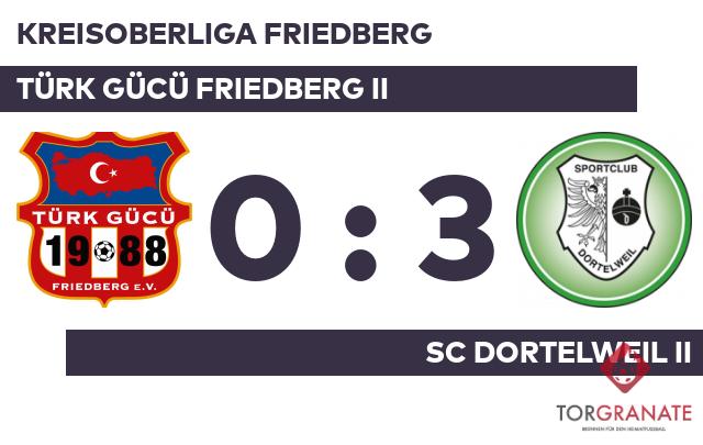 Leon Wiehl brachte sein Team in der elften Minute nach vorn. Michel Maurer musste nach nur 19 Minuten vom Platz, für ihn spielte Sayit Okumus weiter. Nach nur 26 Minuten verließ Benjamin Schmidthals vom TG Friedberg II das Feld, Onur Celik kam in die Partie. Weitere Tore blieben bis zum Pfiff des Schiedsrichters aus. Somit ging es mit einem unveränderten Stand in die Halbzeitpause. Moritz Holstein erhöhte den Vorsprung des SC Dortelweil II nach 82 Minuten auf 2:0. Lukas Engels stellte wenige Minuten vor dem Schlusspfiff den Stand von 3:0 für den Gast her (90.). Letztlich konnte sich das Türk Gücü Friedberg II nicht aus dem Abstiegssog befreien. Gegen den SC Dortelweil II bekam man die Grenzen aufgezeigt.