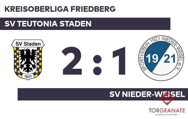 Otto Weber stellte die Weichen für das Heimteam auf Sieg, als er in Minute zehn mit dem 1:0 zur Stelle war. Zur Pause war der SV Teutonia Staden im Fahrwasser und verbuchte eine knappe Führung. In der Halbzeit nahm der SV Nieder-Weisel gleich zwei Wechsel vor. Fortan standen Sebastian Volp und Adrian Vogt für Pascal Rohe und Tom Kette auf dem Platz. Weber schnürte mit seinem zweiten Treffer einen Doppelpack und brachte seine Mannschaft auf die Siegerstraße (52.). Das 1:2 des SV Nieder-Weisel bejubelte Vogt (80.). Letzten Endes ging der SV Teutonia Staden im Duell mit dem SV Nieder-Weisel als Sieger hervor.